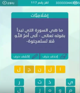 حل سؤال ما هى السورة التى تبدا بقوله تعالى اتى امر الله فلا تستعجلوه رقم 117 من لعبة وصلة للمجم صقور الإبدآع