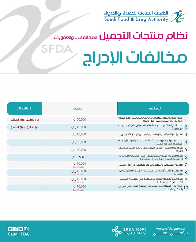 الغذاء والدواء عقوبات مالية وإغلاق المنشأة وتعليق تسجيل منتجات لمخالفي نظام التجميل الهيئة العامة للغذاء والدواء
